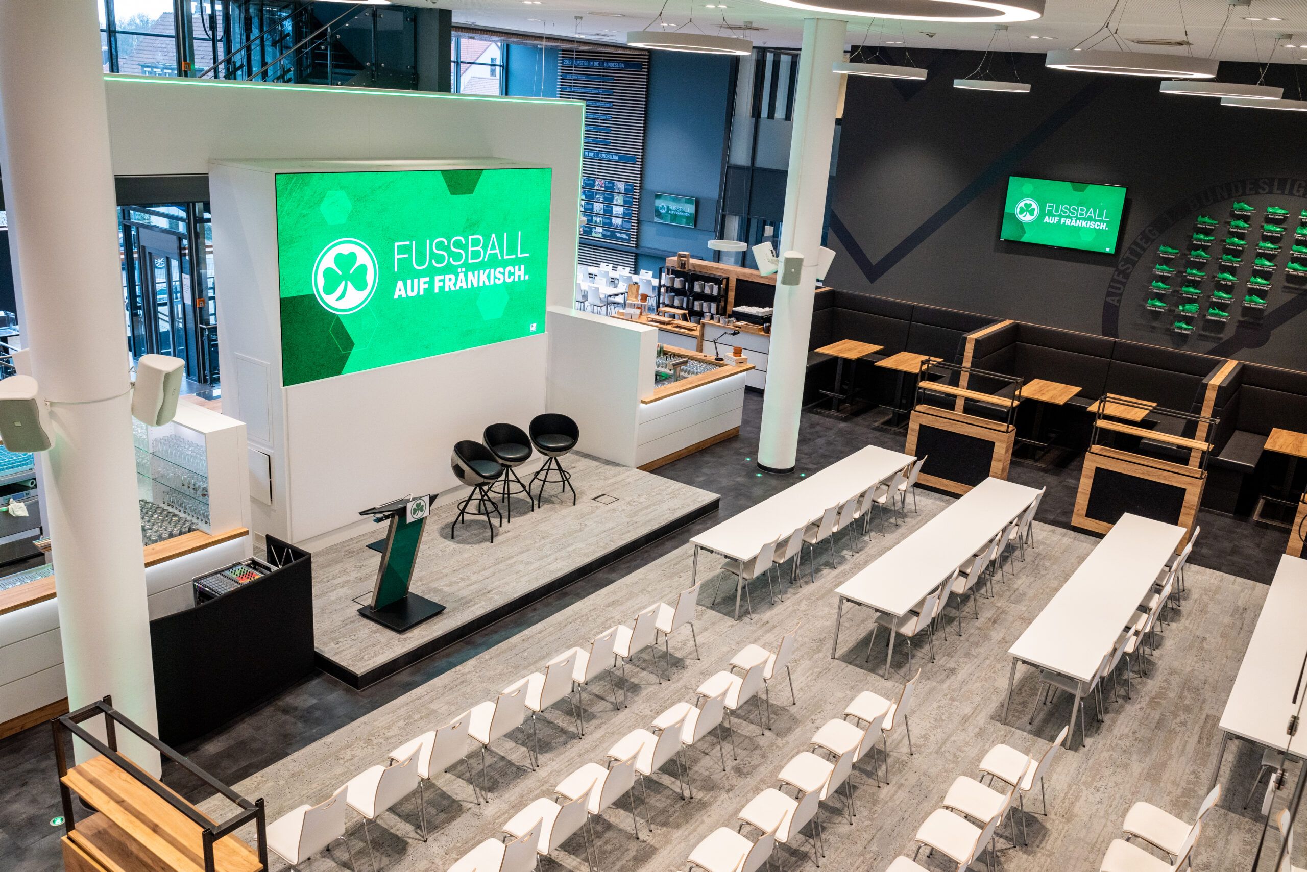 At the home stadium of SPVGG GREUTHER FÜRTH, your business event becomes an unforgettable experience. Modern, flexible, and steeped in the traditional stadium atmosphere, we offer an event location for all kinds of business events, from small gatherings to large-scale celebrations: meetings, photo shoots, conferences, workshops, product presentations, trade fairs, exclusive company parties, and much more. Top-notch facilities, professional support, flexible room layouts, and that certain something you can't book – the unique atmosphere.